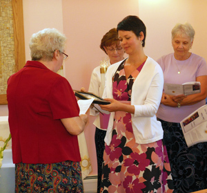 Ms. Jayne Pickett receives the Mission Statement of the Sisters of the Presentation